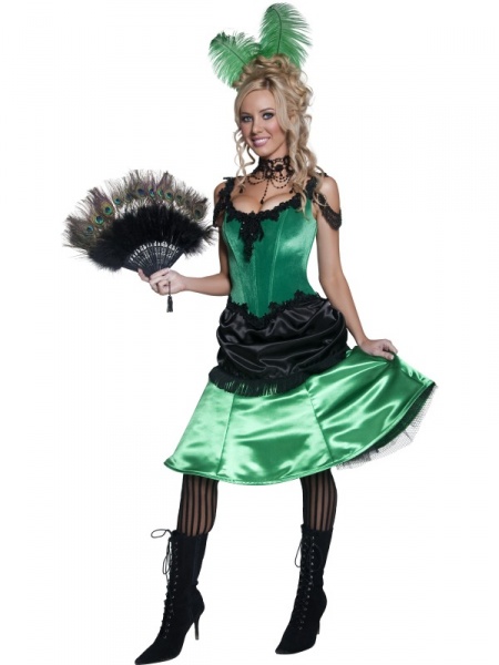 Tento oslňující kostým pro kankánovou tanečnici se skládá z černo-zelených šatů ze saténu a sponky do vlasů s péry. Ideální kostým pro každou párty ve stylu divokého západu.