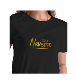 Dámské triko černé barvy se zlatým nápisem “Nevěsta " je ideální pro všechny nevěsty, které mají před svatbou a chystají se na rozlučku se svobodou.Triko je ze 100% bavlny.