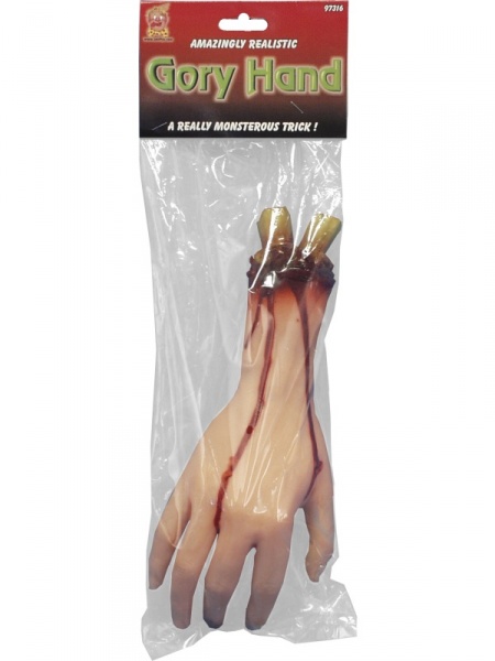 Na halloweenskou nebo hororovou párty můžete vzít tuto realisticky vyhlížející uříznutou ruku s trčícími kostmi a vnitřnostmi.