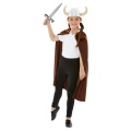 Dětský unisex set zdatného bojovného Vikinga, kterou tvoří hnědý plášť, helma s rohy a meč.