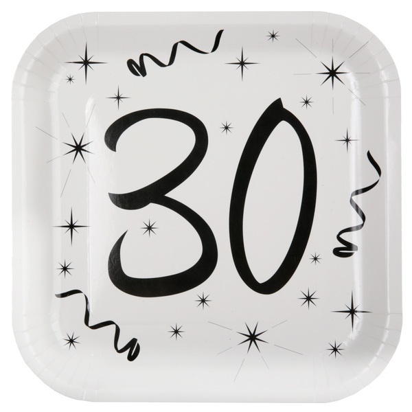 Tento čtvercový bílo-černý talířek s číslem 30 se bude hodit na všechny typy slavností a výročí 30 let.