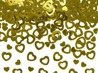 Metalické konfety ve tvaru srdíček ve zlaté barvě které jsou ideální pro výzdobu svatební hostiny nebo večírku pro zamilované.