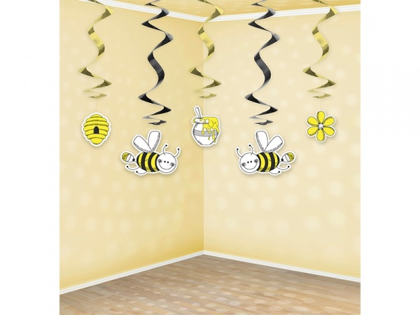 Závěsné spirály s obrázky včeliček, kytičky, medu a úlu.